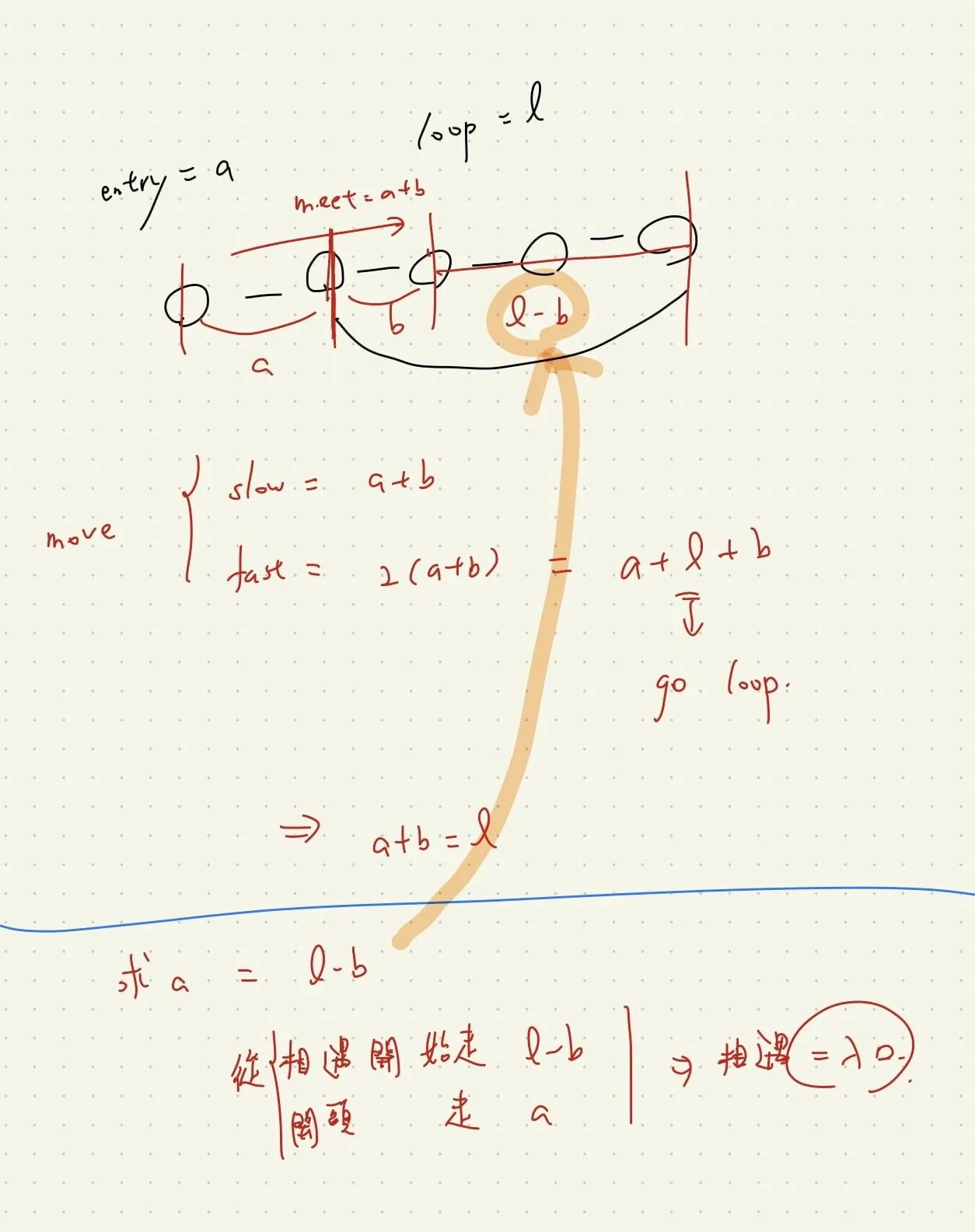 - slow, fast 相遇處為 a+b (相距迴圈入口 b)