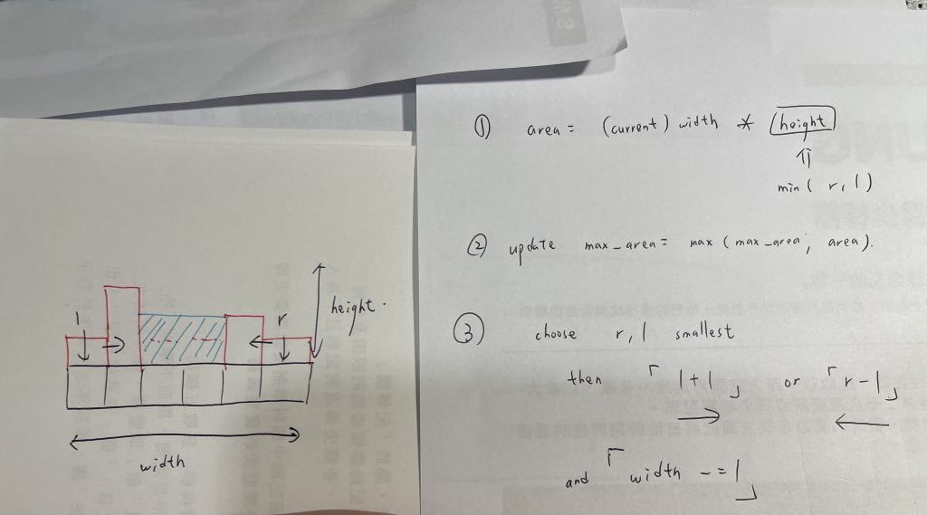 從 height[r], height[l] 選比較矮的,往前走尋找更高的