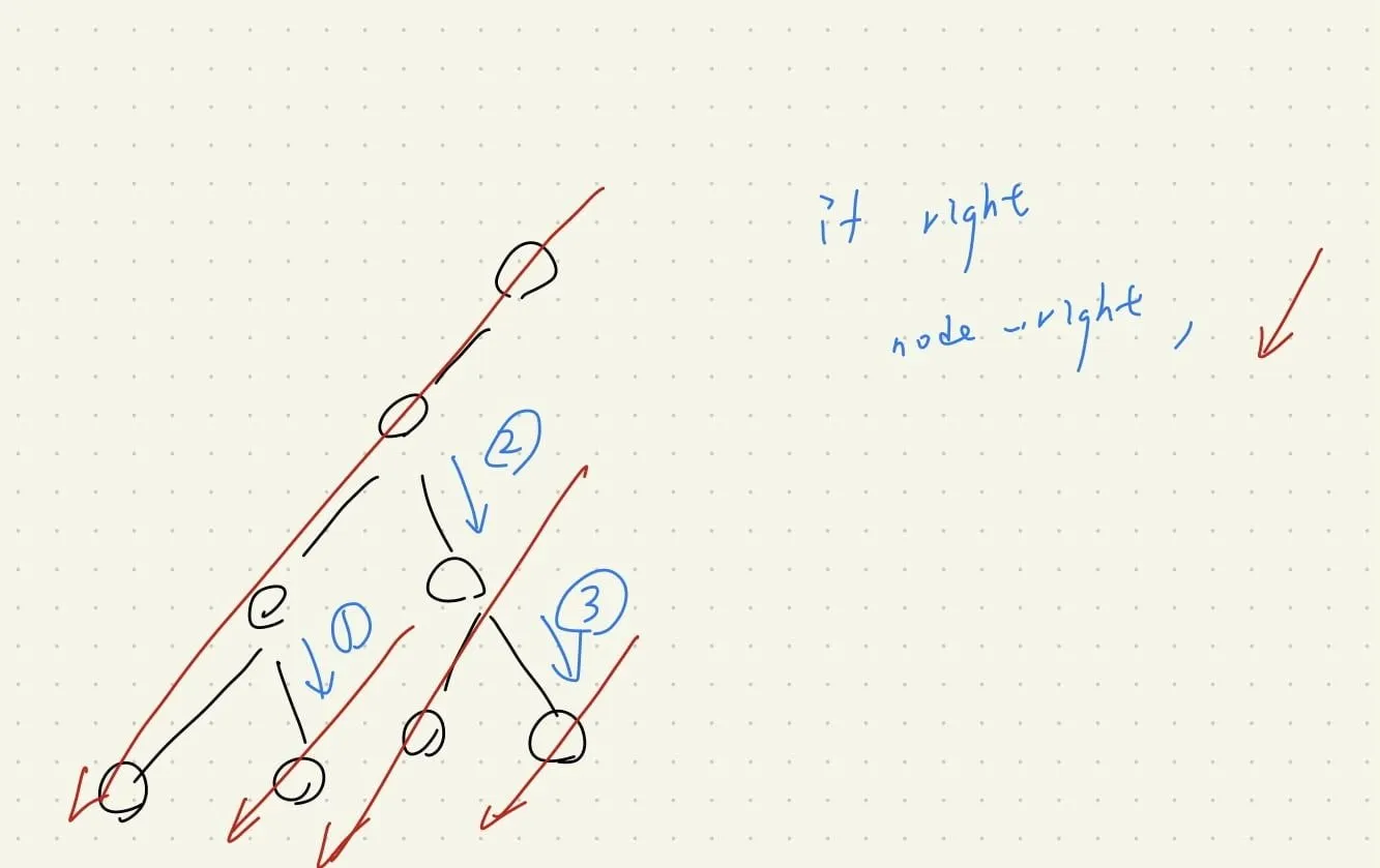 - 當已經找不到右邊時,下一個節點位於「一路 pop,直到 parent.right != node」(往右走的路都退回,找第一個左彎的點),然後他的 parent 就是我們要的下一個 node