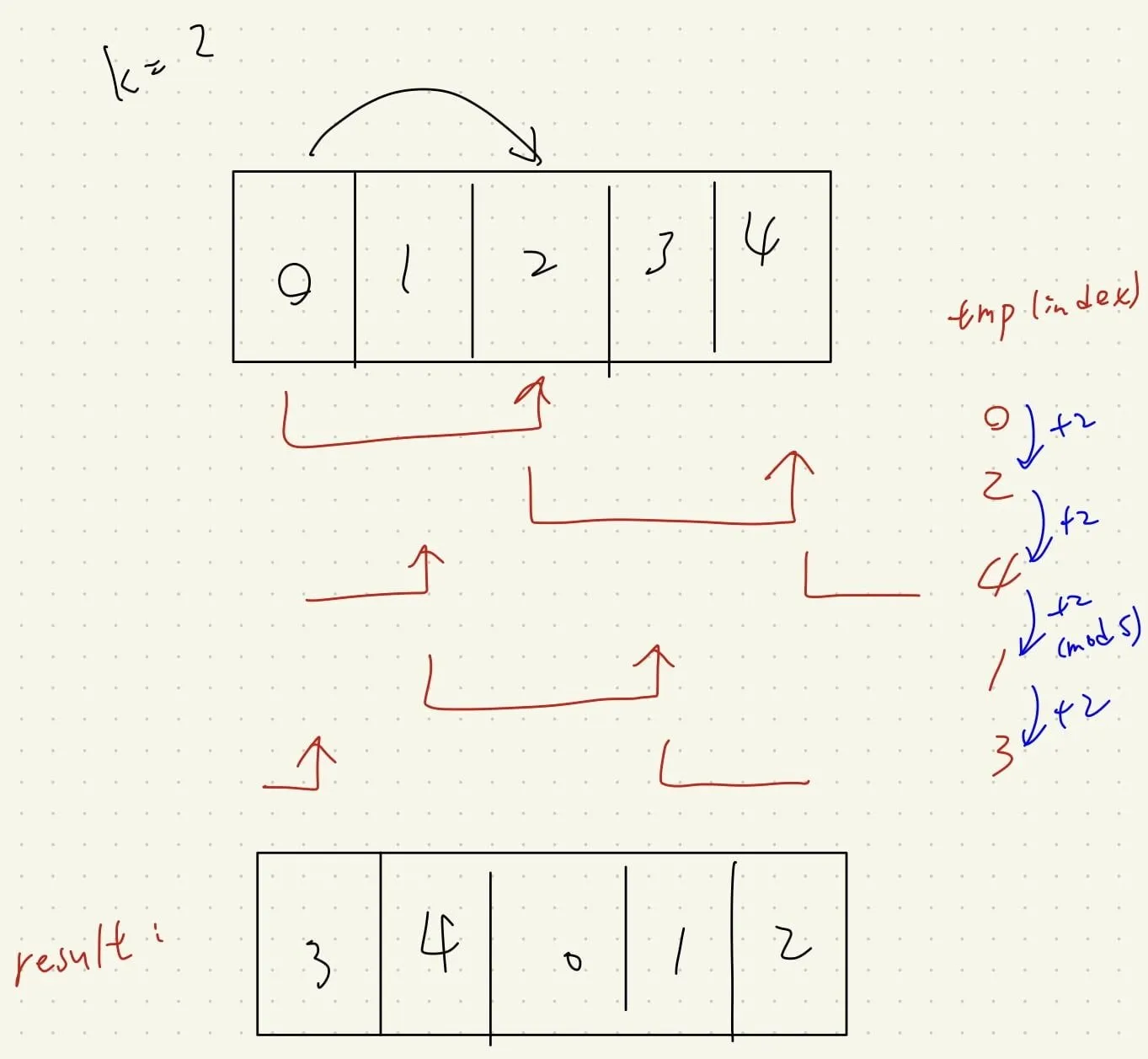 我們可以觀察,k=2 時,我們下一個移動的目標 next_i = (i+k)%(array長度) <- 取餘數
