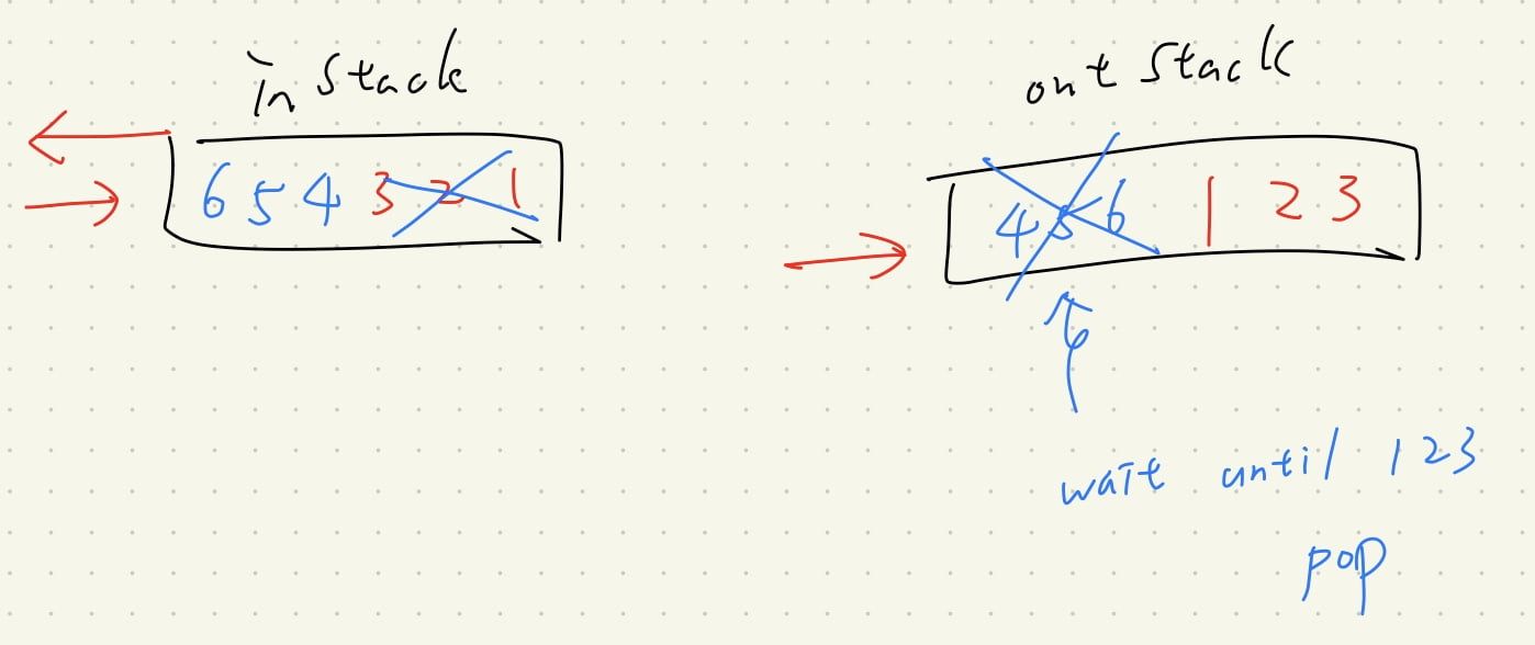 - pop:從 outStack 拿出一筆資料,在這之前應該會需要經過把 inStack 的資料全部以 FILO 放入 outStack