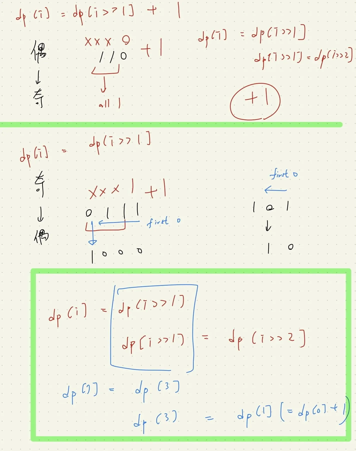- 偶 -> 奇:最好討論的情況,因為末位一定是 0,dp[i] = dp[i»1] + 1,(dp[i»1] 代表左側所有位數)