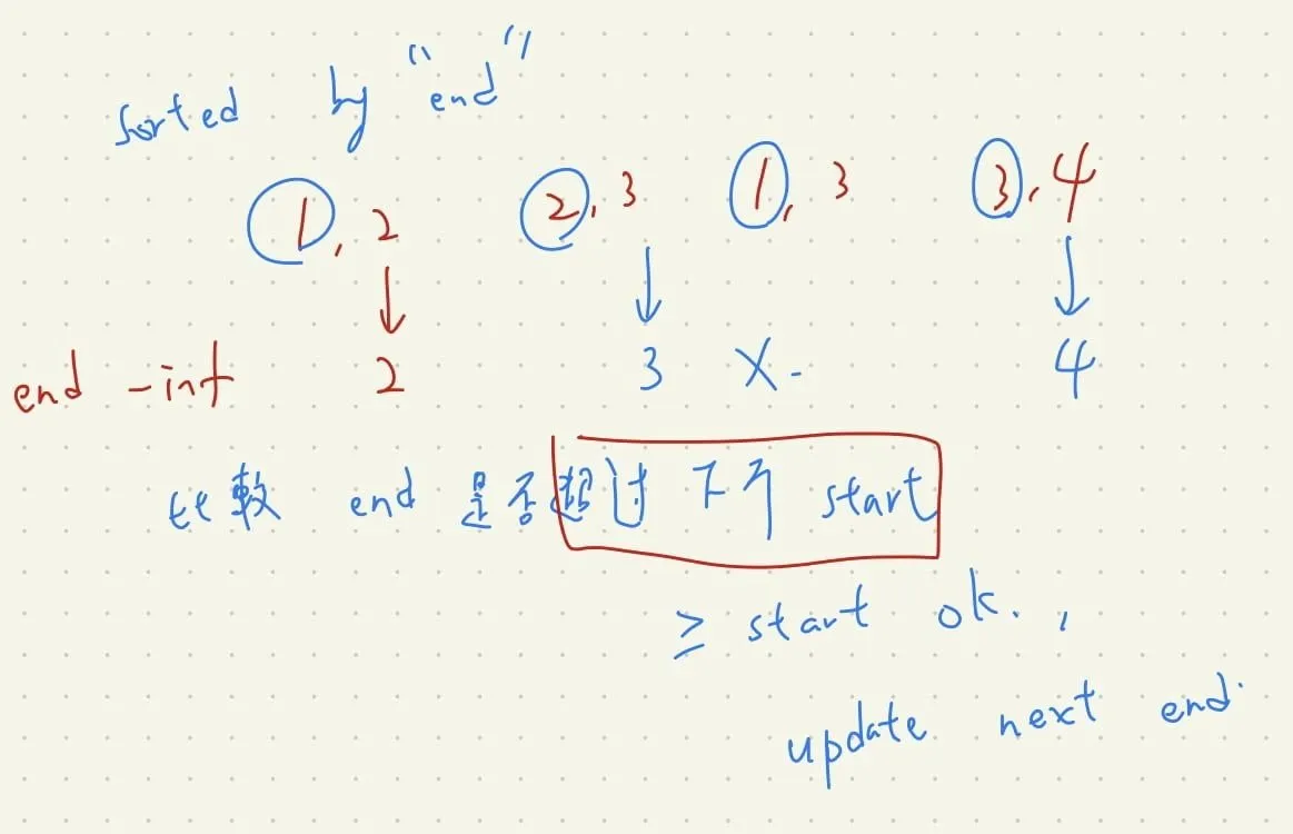 - 正常情況:如果每一次 start >= 前一個 end (表示無重疊),且因為我們已經先將 end 排序,因此可以視為得到所有以 end 開頭的區間。
