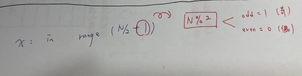 我們將範圍公式都改寫成:「in range (N/2 + N%2)」,這樣就非常漂亮了!
