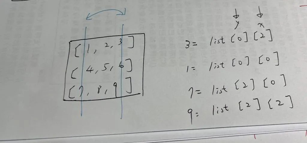 主要原因是:list[list] 會先讀取到第一個是「該行」矩陣,也就是「y軸」
