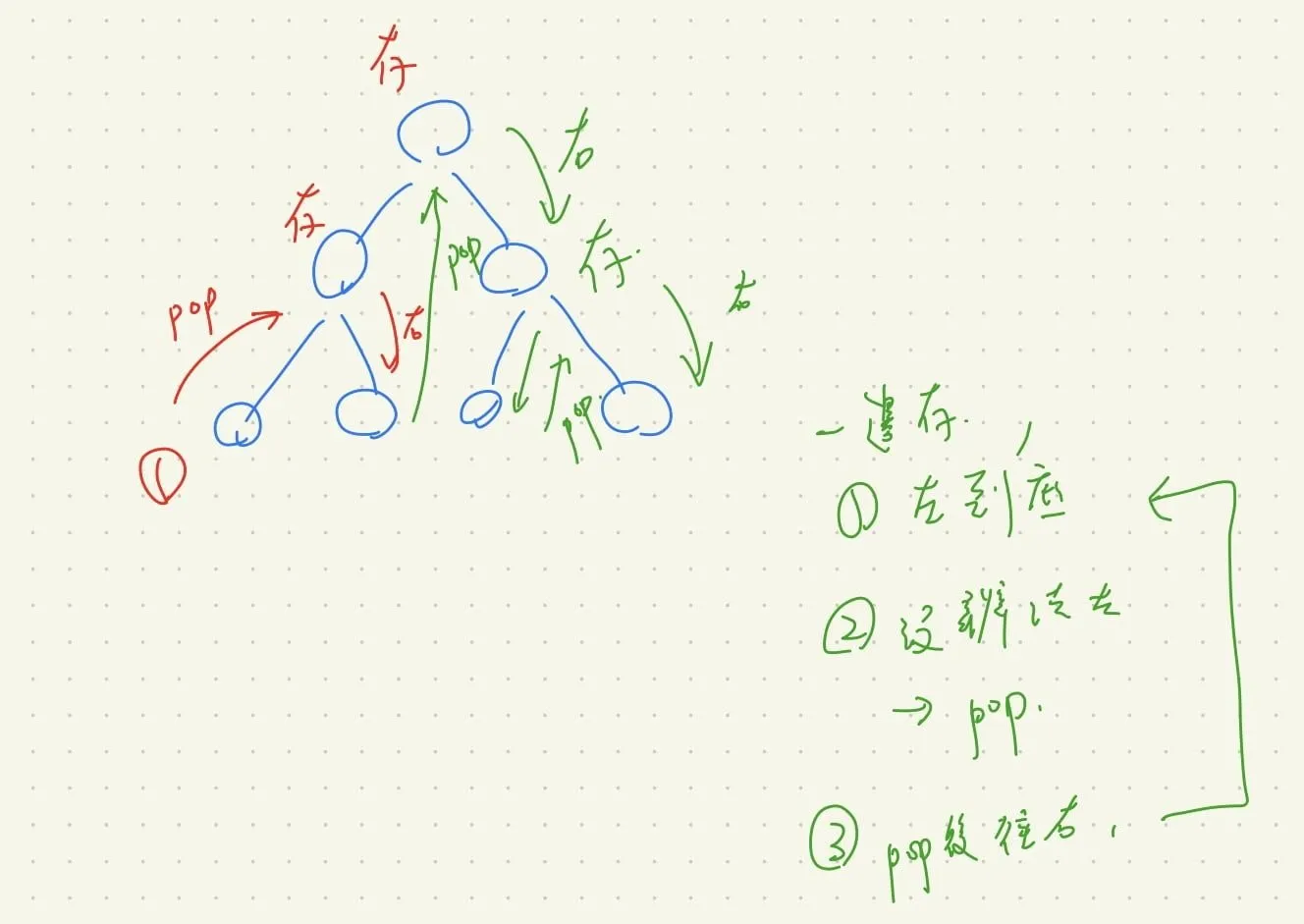 - 向左走到底,一邊存 node 進 stack 當中,