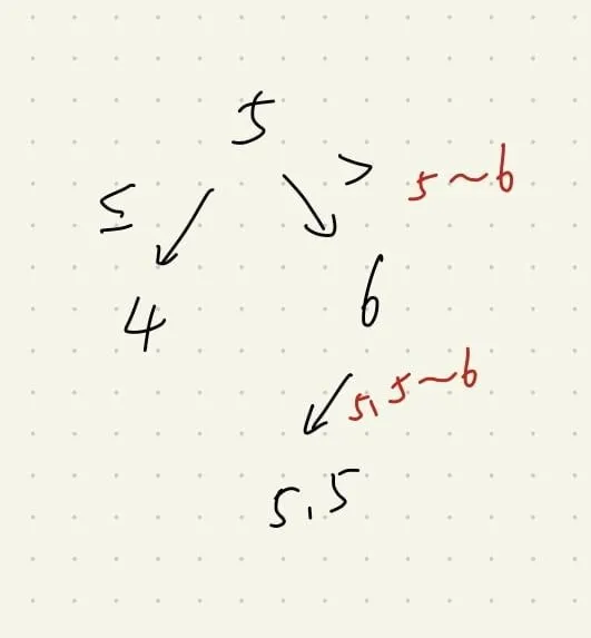 由圖上我們可以發現隨著搜尋過程中,target 區間正在不斷的縮小,此題就是利用這個特性。
