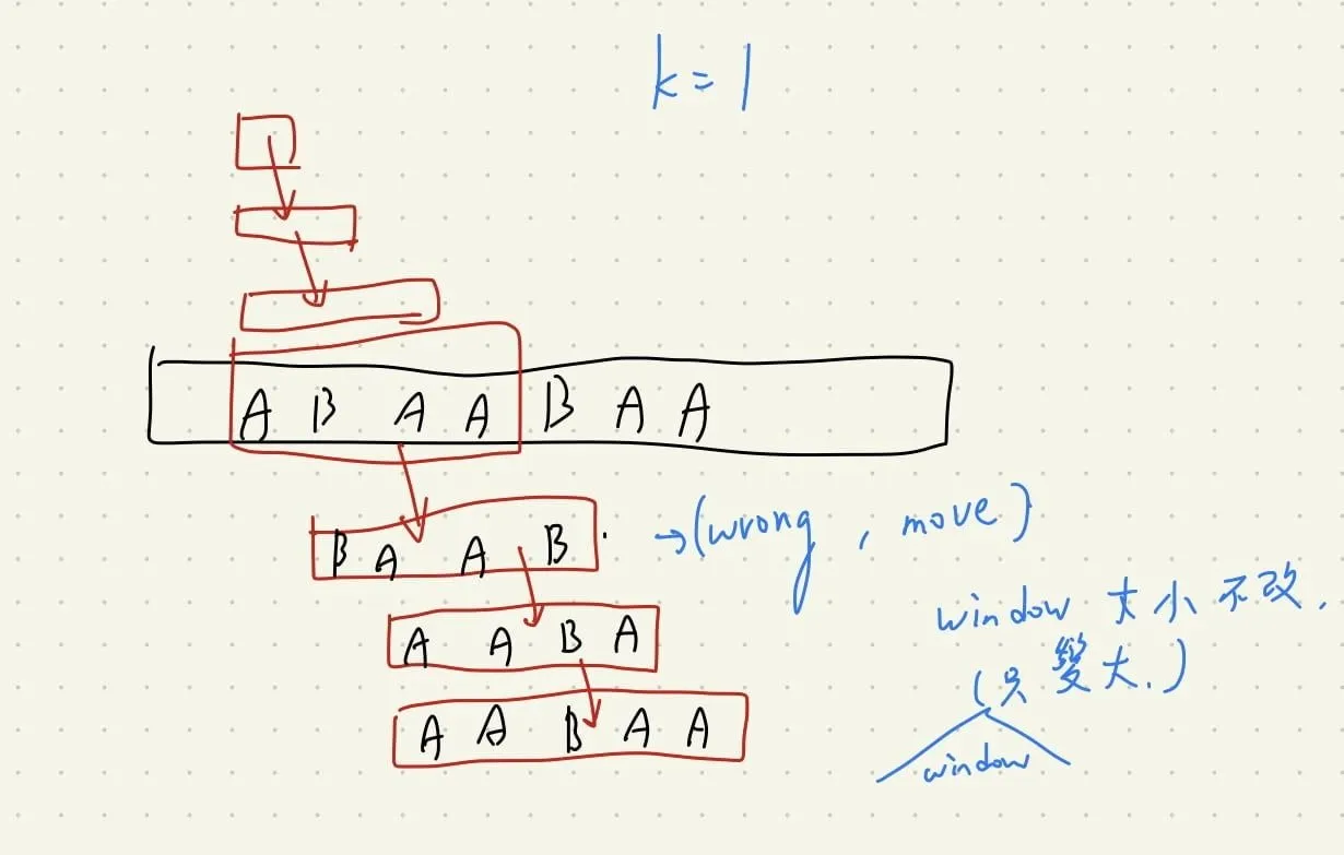 讓我們先來理解題目,這題目主要是在詢問我們在「允許替換最多 k 個文字的情況下」,