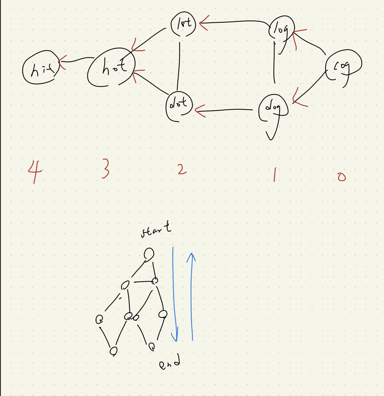 - 先從 endWord 找回 start,再從 start 順便存路徑會最順。