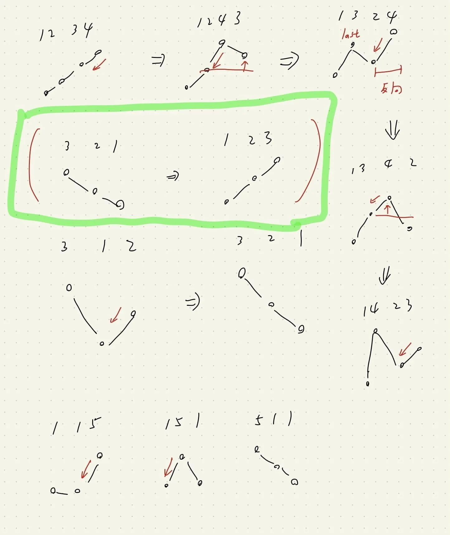 - 如果找到了,交換「往下的那個」與「之前往上的過程中 <= 此數的數字 (注意等於)」,交換後把整個數列顛倒