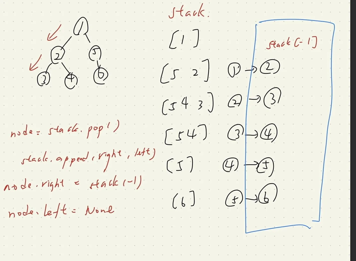 因此是用 return 過程時的路徑 node.right 去連接 prev (這部分概念有點跟 prev 實質意義上顛倒)