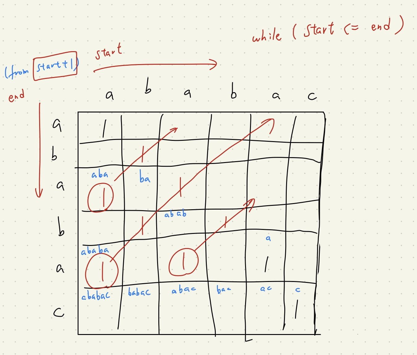如果當發現 dp[i][j] 是 palindrome,那也表示 dp[i+1][j-1] 也是 palindrome,直到 start > end,