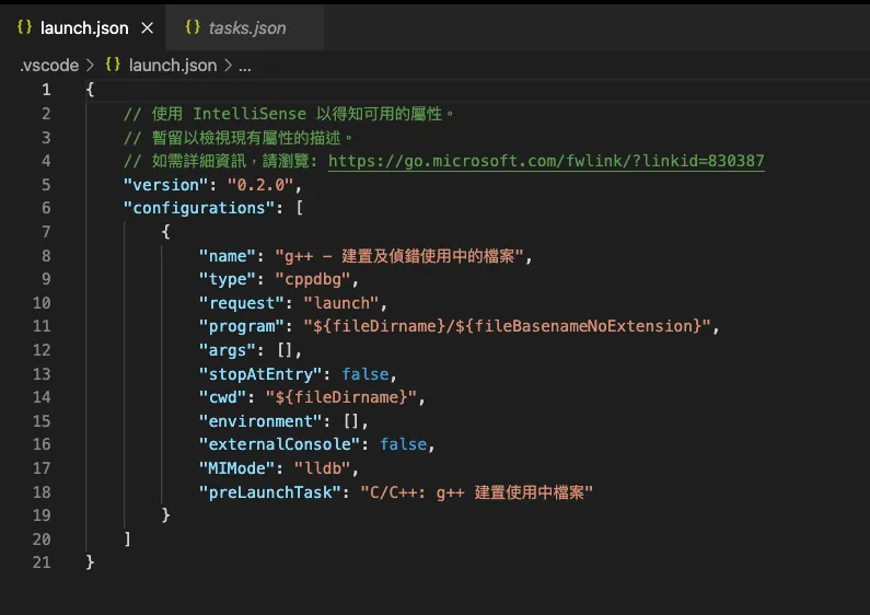 step3. 我們會發現,我們右邊多出兩份檔案「./.vscode/task.json」、「./.vscode/launch.json」