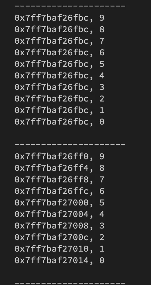 而這裡還有一個重要的觀念,注意輸出結果的部分,我們發現儲存的記憶體位置,