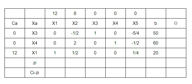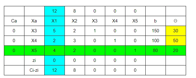 算出來就是Θ,表示如果那行全部投資在X1可以達到的上限,我們可以發現X1最多就是增加20(再多就會超過X5 row的限制了),而X5 row在此就成為我們的pivot row(綠色)