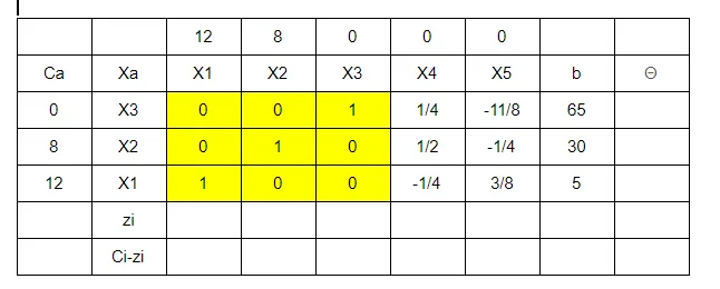 好的,這回合我們找到了解 (X1,X2,X3,X4,X5) = (5,30,65,0,0),