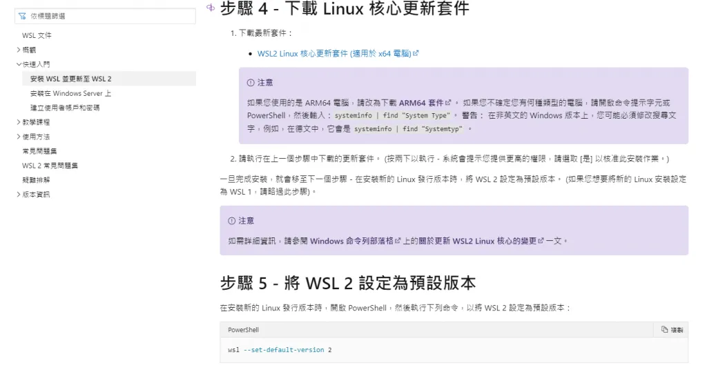 找到圖中「WSL2 Linux 核心更新套件 (適用於 x64 電腦)」的地方,點擊下載