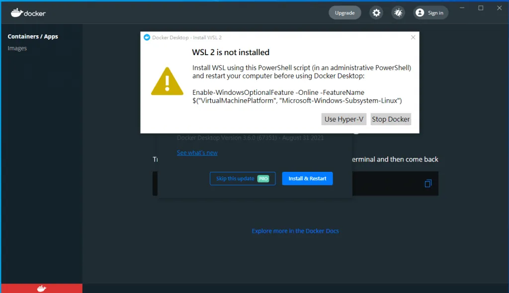 個人有碰過安裝 Docker Desktop 4.0.0 的一些問題,不過目前靠著裝舊版本暫時解決了。)