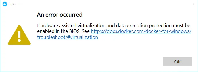 Hardware assisted virtualization and data execution protection must be enabled in the BIOS. See https://docs.docker.com/docker-for-windows/troubleshoot/#virtualization
