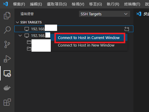 - 範例圖:我們可以從 VScode 側邊的遠端設定當中,直接切換「目前視窗」,變成「遠端的連線視窗」
