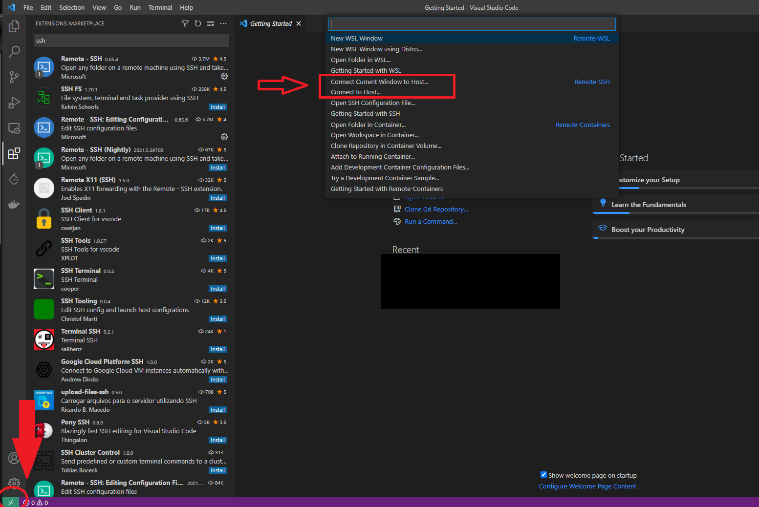 step 2. 在 VScode 左下角啟動連線 ssh 的功能 (記得有學校/公司 VPN 需求的請先在上一步進行連線)