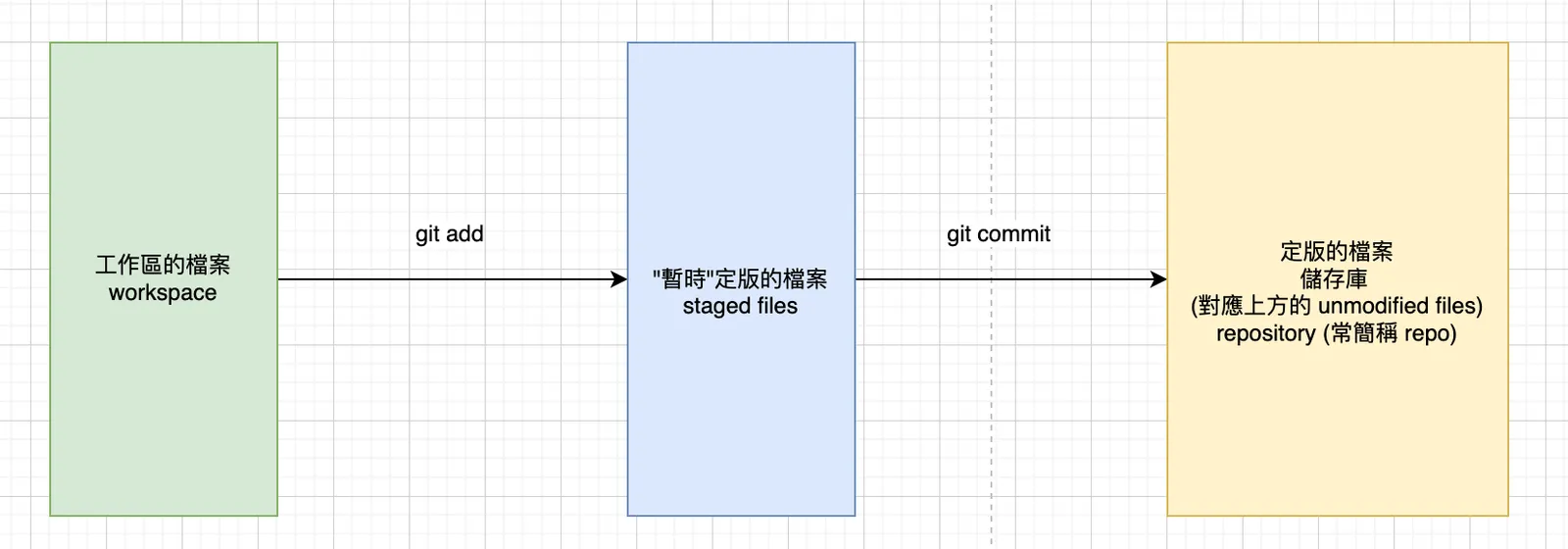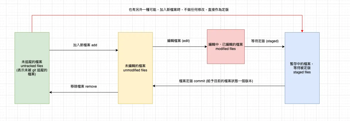- 當我們決定替現在的 git 目錄提交一個定版 (commit),那麼現在的檔案狀態就是未編輯的狀態 (這裡「相對的基準點」就是定版的狀態,因此是未編輯的狀態)