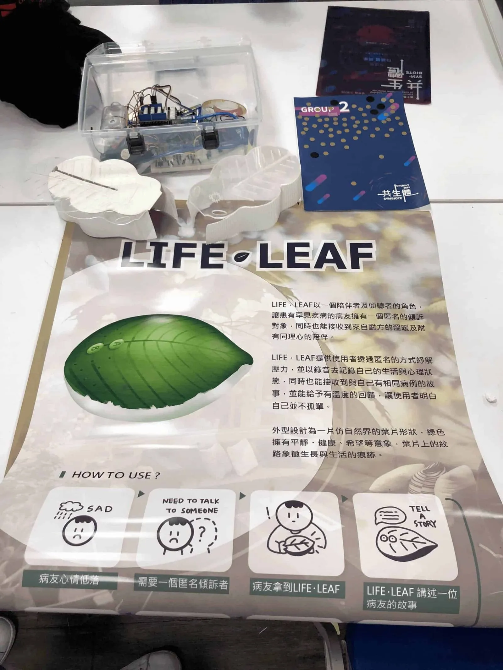 LIFE.LEAF 團隊提供使用者透過匿名的方式紓解壓力,並以錄音去記錄自己的生活與心理狀態,同時也能接收到與自己有相同病例的故事,並能給予觸覺、視覺、嗅覺的回饋,讓使用者明白自己並不孤單。
