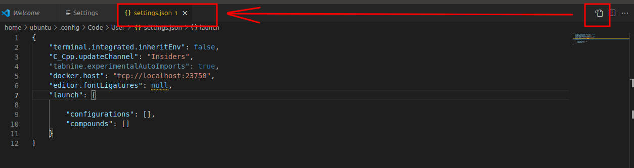 - 或者也可以點擊右上角的符號,也可以叫出 「settings.json」