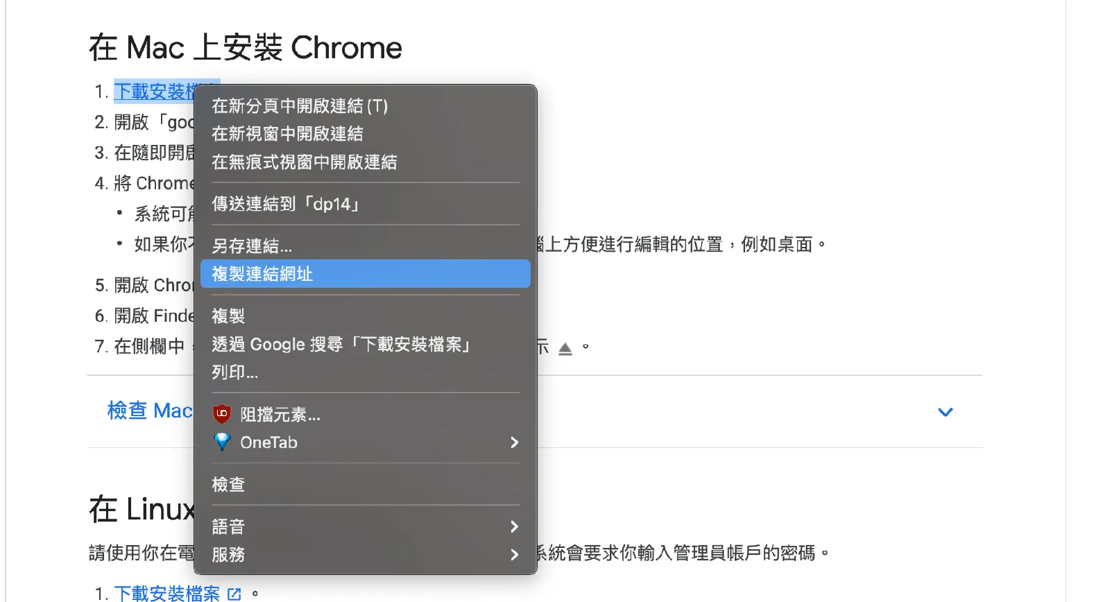 對於可以下載的連結,右鍵選擇「複製連結網址」