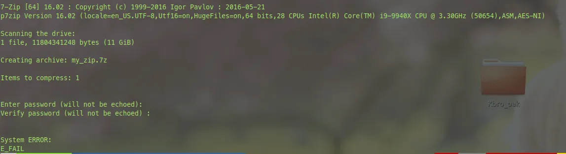 https://unix.stackexchange.com/questions/266870/e-fail-error-in-7zip