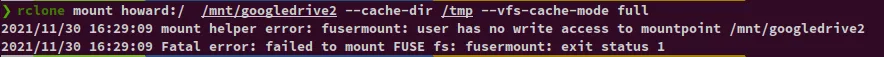 2021/11/30 16:29:09 mount helper error: fusermount: user has no write access to mountpoint /mnt/googledrive