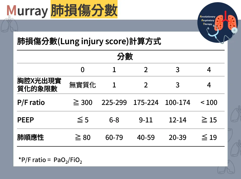 在Ashbaugh後近30年雖然有許多探討ARDS的文獻,但是後續的文獻針對疾病定沒有統一的定義。其中較為著名的為1988年Murray (他是胸腔暨重症教科書的作者,一代重症醫學大師今年3月死於COVID-19 QQ) 等學者提出肺損傷分數(Lung injury score),依據CXR, PaO2/FiO2 ratio, PEEP, lung compliance,四個部分來替肺損傷做0-4分的評分,四部分加總後取平均值,如果大於2.5分就算是ARDS。即便有此篇著名的定義,仍舊沒有成為國際上廣為接受的定義。