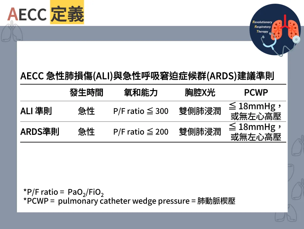 直到1994年由美國ATS與歐洲ERS的醫學專家們招開歐美共識會議(The American-European Consensus Conference, AECC),正式將此疾病定義為ARDS (Acute Respiratory Distress Syndrome),不再侷限其於成人身上發生,同時也完整的定義急性肺損傷(Acute lung injury, ALI)與ARDS。