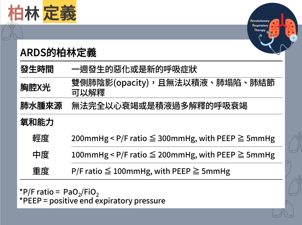 - CXR雖維持與AECC相同,但是柏林定義新增文字說明「雙側肺陰影 (opacity)必須無法完全以積液、肺塌陷或肺結節可以解釋。」