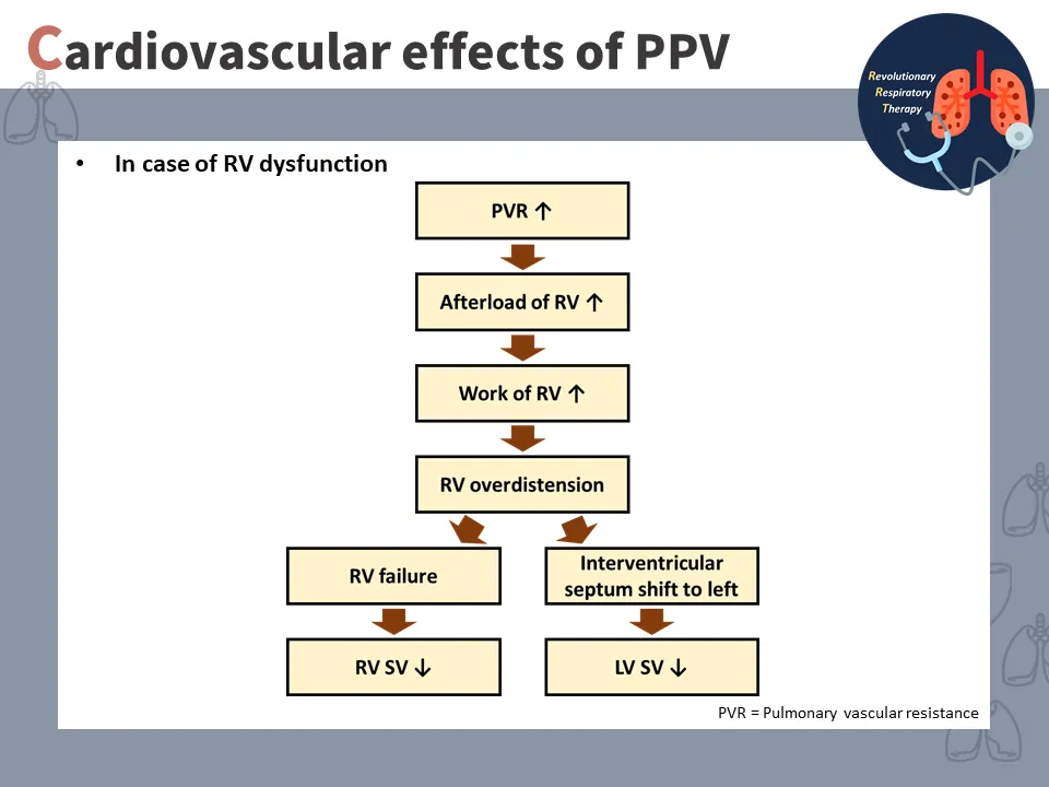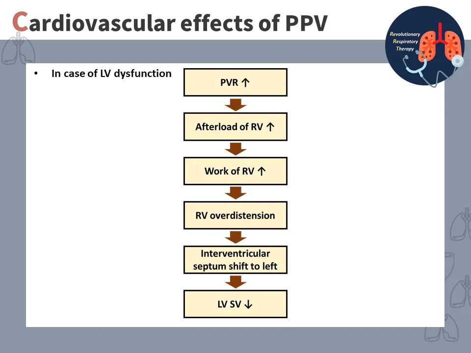正壓吸氣期(inspiration)時: 機械提供正壓通氣 → 肺泡壓↑ → 肋膜壓↑ → 胸內壓(intrathoracic pressure)↑ → 靜脈回流↓ →〔左心衰竭 → 肺血管阻力上升 → 右心 afterload↑ → RV擴張 → 心中膈shift to left〕→ 左心輸出↓