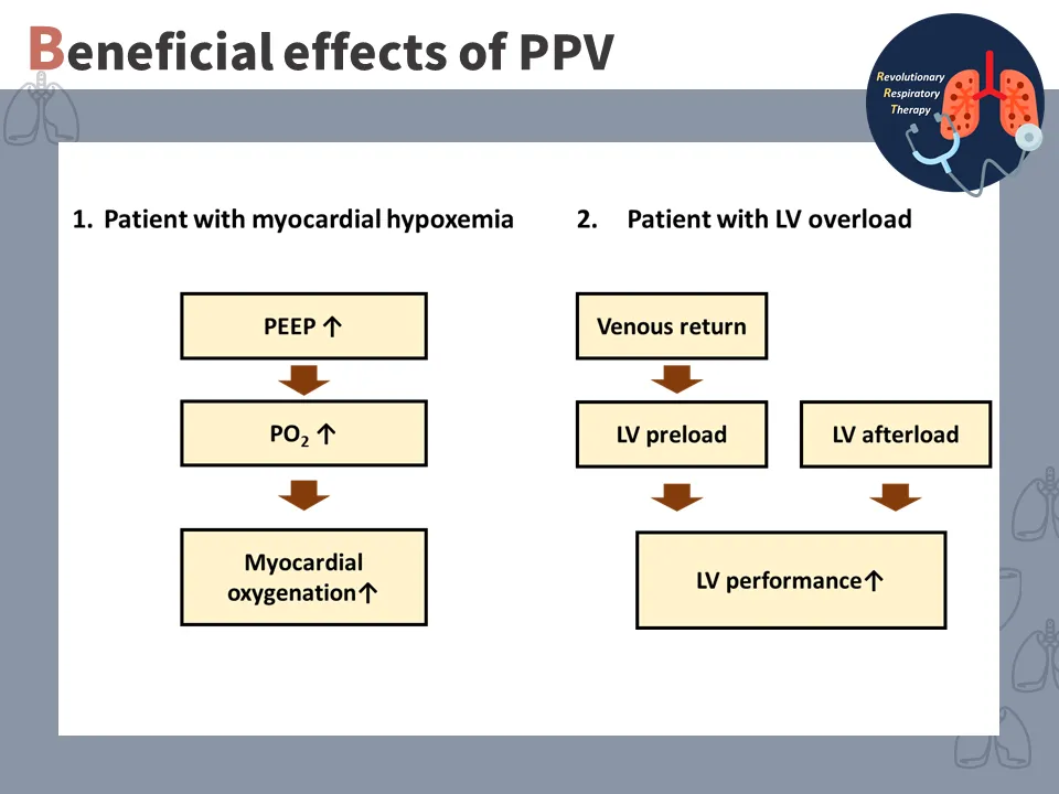 正壓吸氣期(inspiration)時: 機械提供正壓通氣 → 肺泡壓↑ → 肋膜壓↑ → 胸內壓(intrathoracic pressure) ↑ → 靜脈回流↓ → 心輸出↓