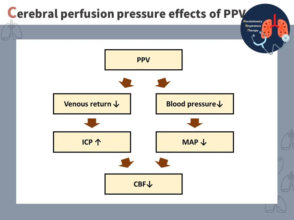 正壓通氣會增加Mean airway pressure, MAP (呼吸道平均壓),而呼吸道平均壓會使得Mean arterial pressure, MAP (平均動脈壓) 下降,進而使腦部灌流壓下降,這會導致腦內血流下降(CBF)。對於正常人來說是可以代償這點壓力,但是在一些腦受損或腫瘤的病人身上發生IICP 的情形。過去許多文獻指出高PaCO2 可能導致腦內血管收縮,間接導致ICP 升高的情形,因此曾經有讓呼吸器過度通氣產生permissive hypocapnia (32–45 mmHg)的治療策略,但是這樣的作法僅能在短時間內影響腦壓,且無法顯著改善病人預後,因此近些年較不流行這樣的做法。目前比較主流的方式是透過調整適當的PEEP (< 5cmH2O)以降低Mean airway pressure, MAP (呼吸道平均壓) 對腦壓的影響。