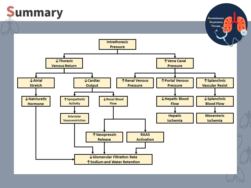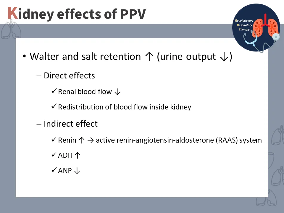 正壓通氣會使得周邊血流整體的血流量下降,其中會包括腎臟血流,而腎絲球過濾血液需仰賴輸入的血流,而這樣的現象會導致體內的水分與電解質滯留於體內。上述狀況會使體內的血壓上升,拮抗調控體內的血壓。當血壓過高時,會啟動體內的 腎素-血管張力素-醛固酮系統(renin-angiotensin-aldosterone system, RAAS),藉此調控血壓的穩定。