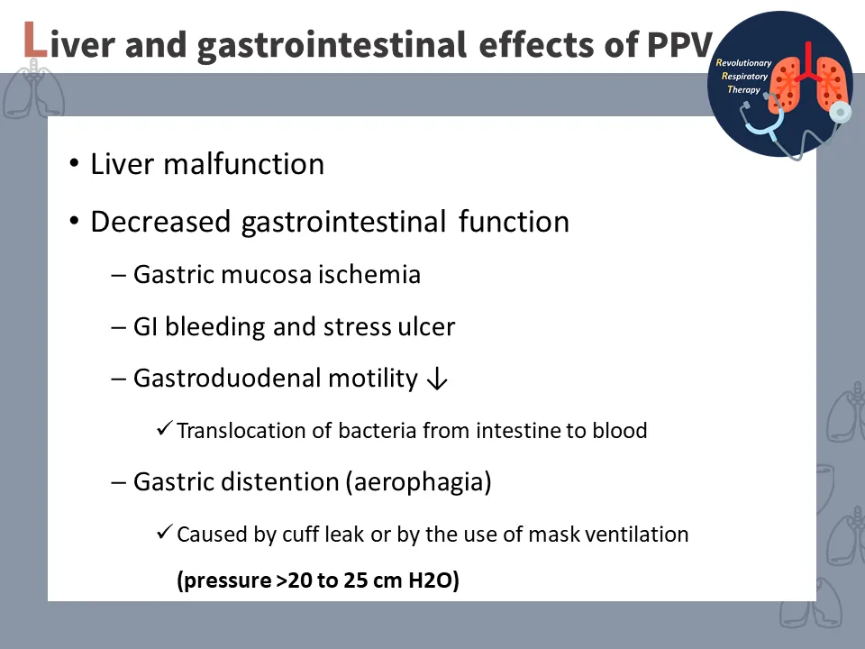 如同腎臟血流會受到正壓通氣的影響,肝臟與胃腸道血流也會因正壓通氣而減少,導致缺血性的問題,如果發生缺血性腸疾 (Ischemia bowel)等問題,會使得重症病人死亡率上升。另外如果是使用非侵襲式呼吸器(Non-invasive ventilator, NIV) 且正壓通氣壓力高於20cmH2O,可能會使得氣體打入胃內,使得患者腹脹,因此建議這一類患者需要放置鼻胃管,以方便減壓。