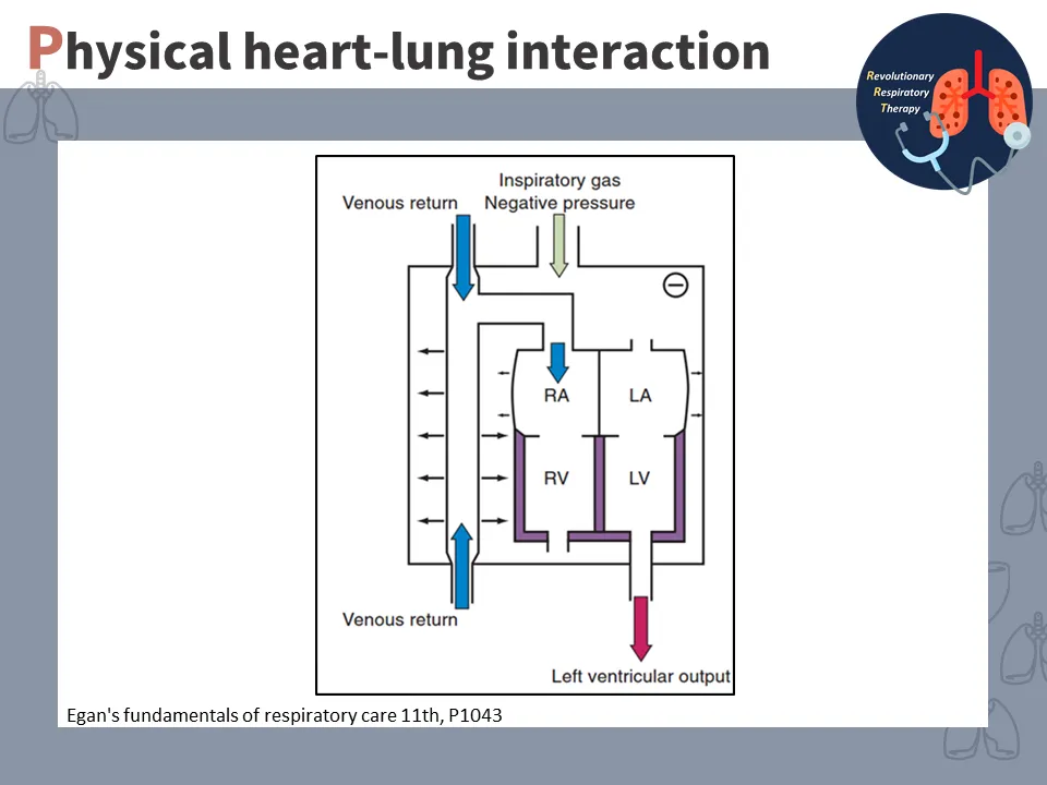 自發性吸氣(inspiration)時: 肋間肌收縮 → 胸腔擴張 (肋膜壓↓) → 吸氣 → 胸內壓(intrathoracic pressure)↓ → 靜脈回流↑ → 心輸出↑