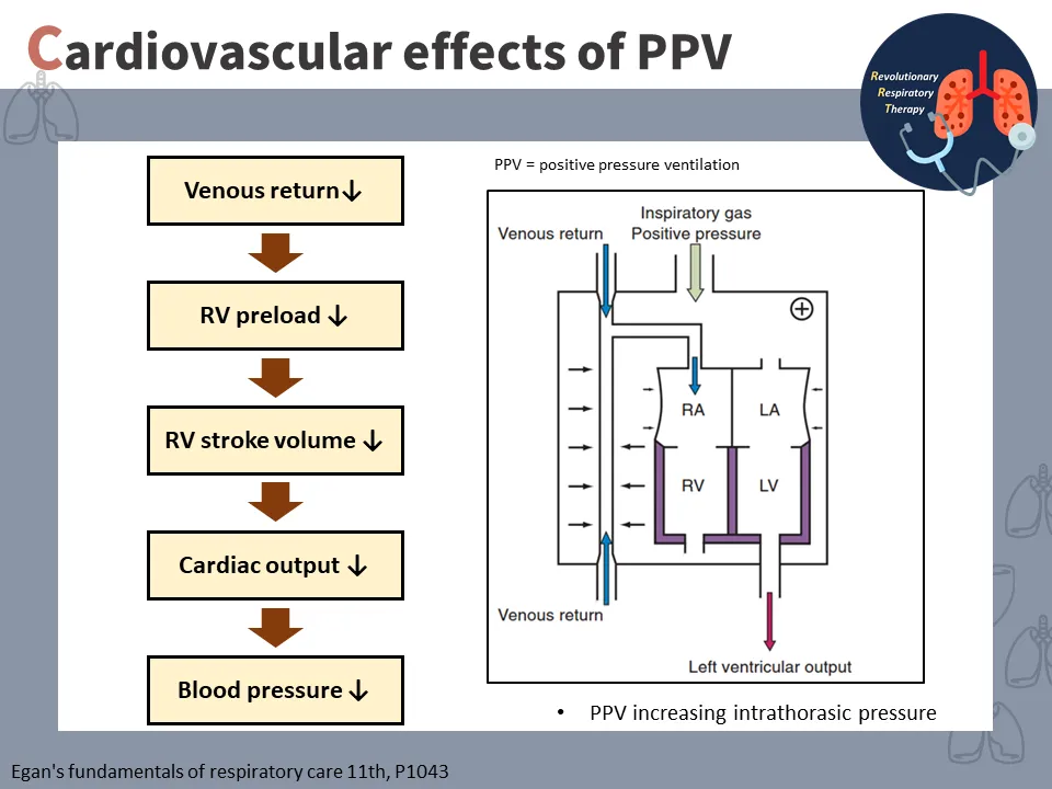 機械提供正壓通氣 → 肺泡壓↑ → 肋膜壓↑ → 胸內壓(intrathoracic pressure)↑ → 靜脈回流↓ →