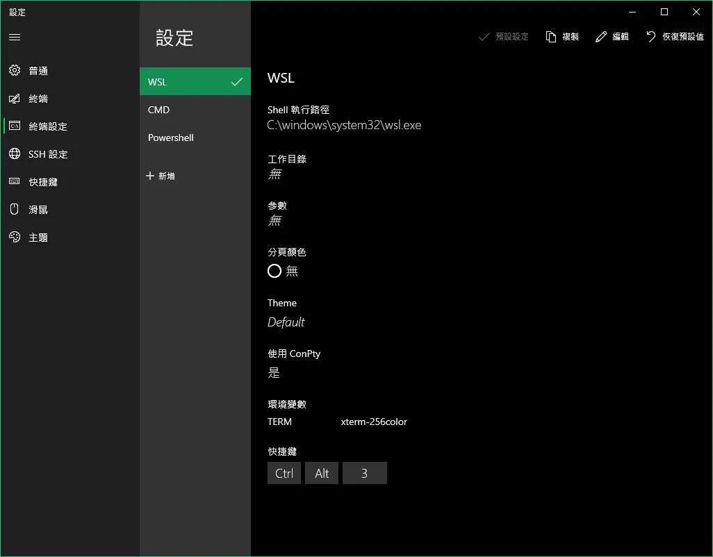 我們需要去修改「終端設定」裡面的選項,修改為 WSL,