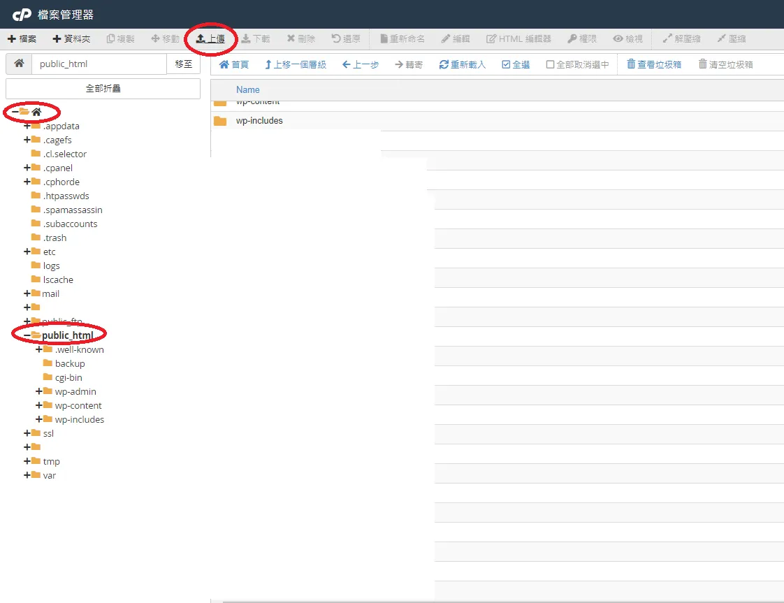 找到「home」底下的「public_html」,按上面的上傳,把 ads.txt 傳到這個資料夾裡面。