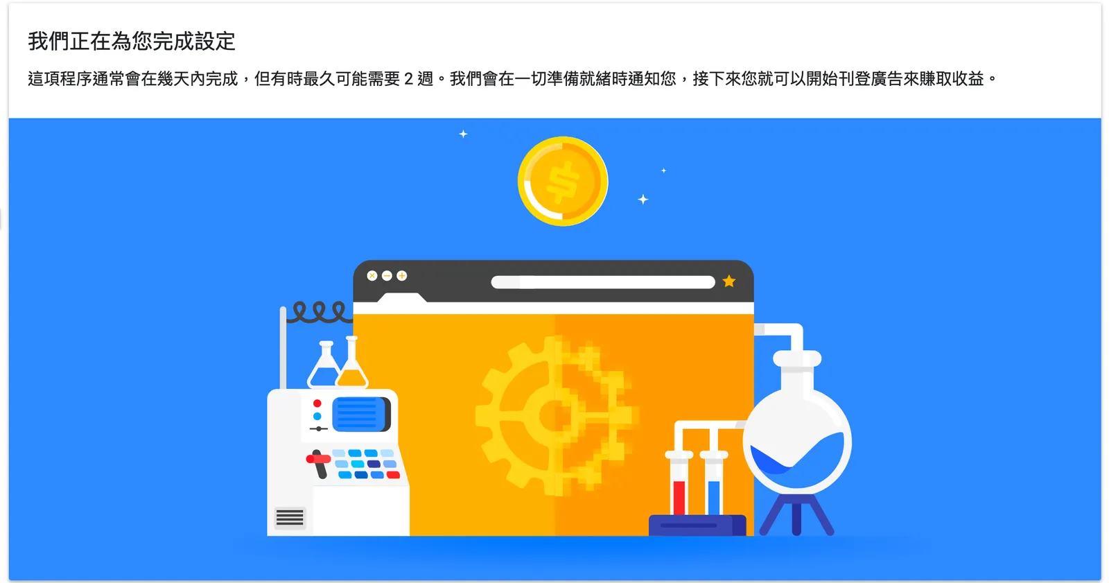 這項程序通常會在幾天內完成,但有時最久可能需要 2 週。我們會在一切準備就緒時通知您,接下來您就可以開始刊登廣告來賺取收益。