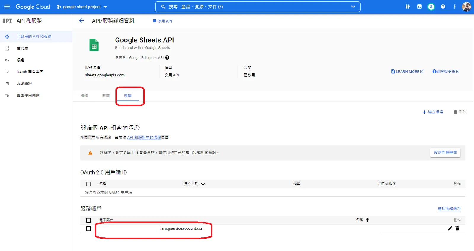 是因為我還「沒有把 google sheet 的編輯權限給 API 的 email」,