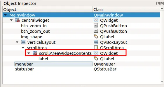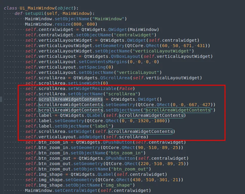 - 最後一行的 self.scrollArea.setWidget(self.scrollAreaWidgetContents),因為我們已經去除了 self.scrollAreaWidgetContents 這個元素,改以 Qlabel 顯示的圖片直接置入 self.scrollArea 當中,因此我們修改成 self.scrollArea.setWidget(self.label)。