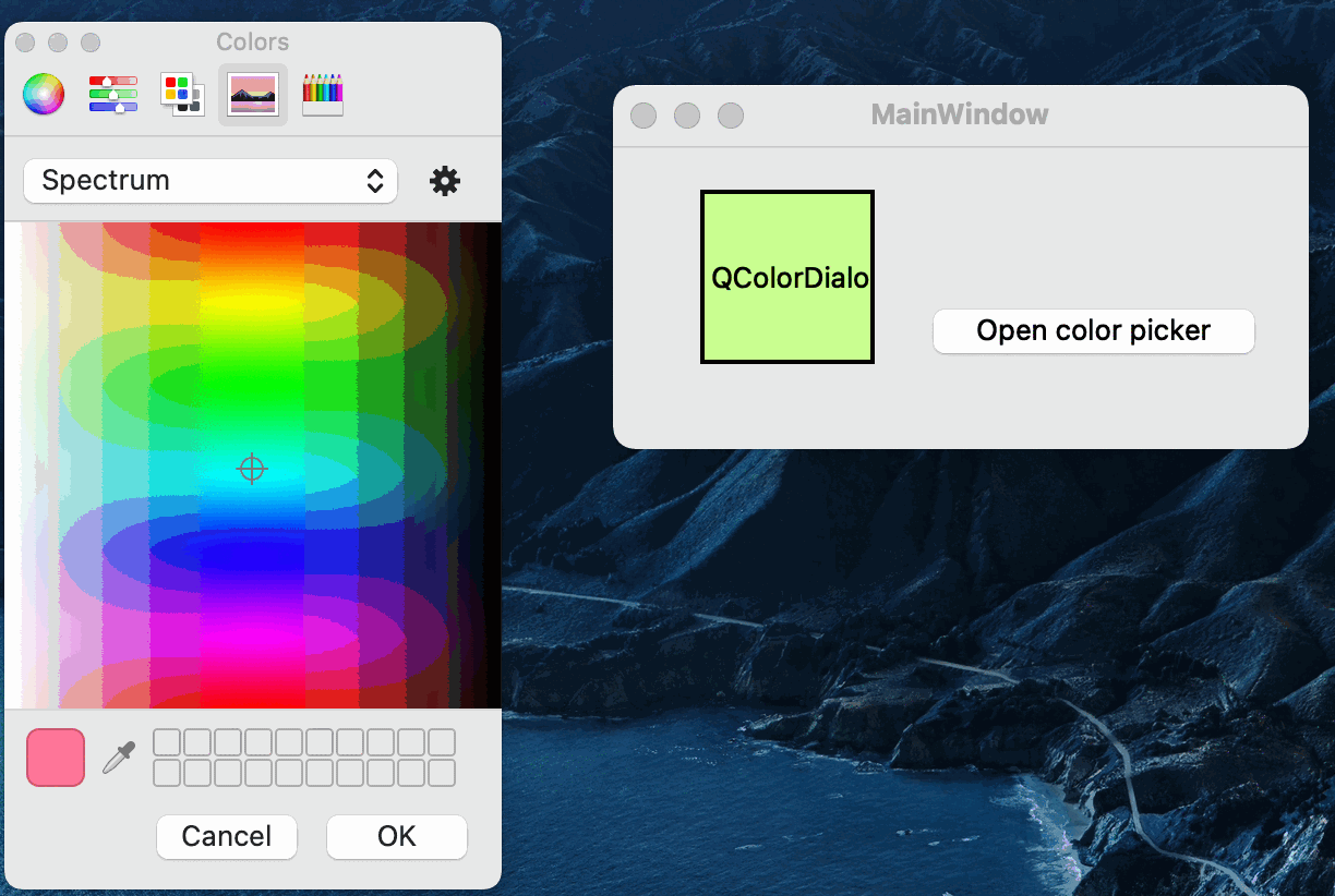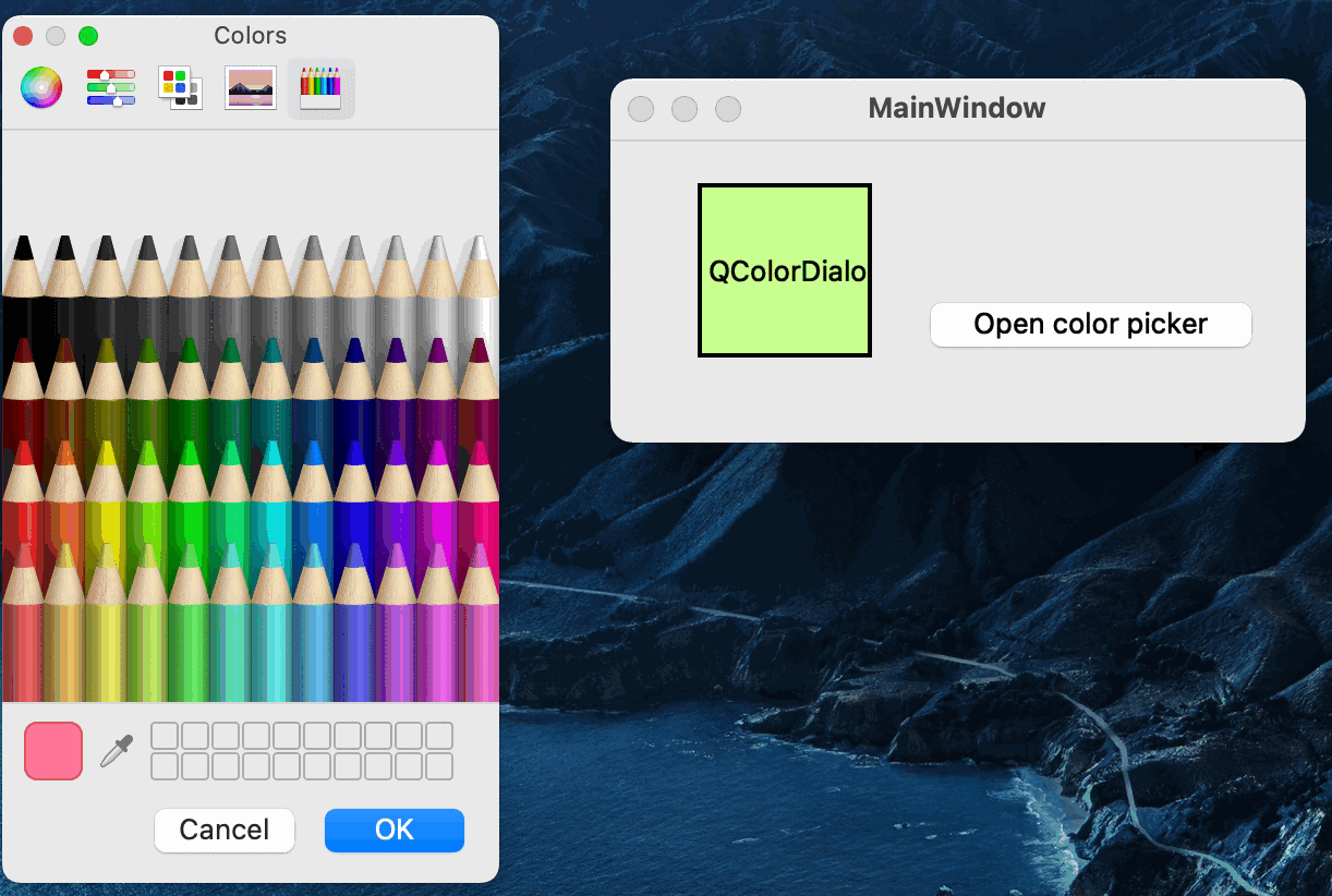 在 mac, windows, linux 上都會有系統預設的調色盤 QColorDialog,