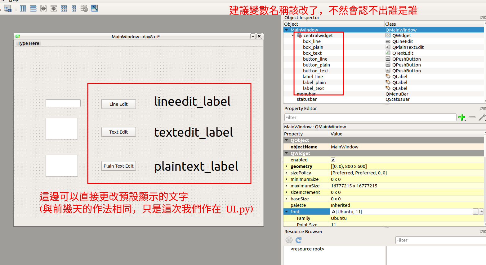 我們剛剛在 Qtdesigner 修改的內容,直接反應在 class 的成員名稱上,